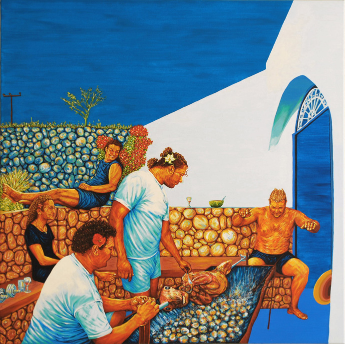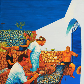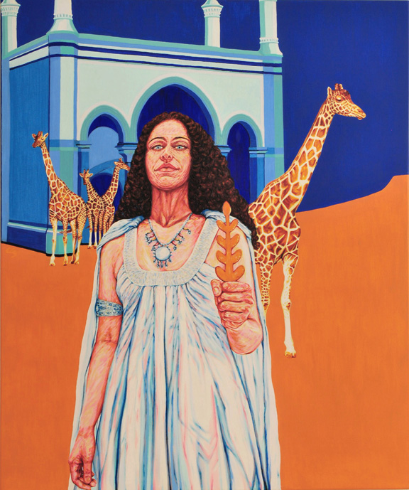 field of chromatology lends her a strong ability of treating colour as one of the most important expressive means of painting. Activating all of its inherent powers and qualities and aiming at achieving her various goals and succeeding in creating a varied scale of sensory, mental and emotional effects on the viewer. The pervasive and combinatorial way in which she uses the deciphered codes of colour is one of the main features of Alessandra Dimitra’s art. Of particular interest is also the creation of the background, the space where human experience takes place, which is usually divided into three levels. The first level, the one closest to the viewer, is occupied by the human figures, while the second, middle plane is characterized by an object or an architectural element. The third level consists of monochromatic, flat pieces: In the second and third level the geometricality of the space’s structure is revealed by the constantly ‘sober’ and steady movement of the brush. In Alessandra Dimitra’s works the space possesses a kind of energy that does not assert itself on the human figures, but gives them scope to develop their actions. In summary, Alessandra Dimitra’s unique stylistic expression could be described as 'expressionistic realism’, but one that leaves room for the experimentations of the imagination, the dream, the myth and its symbolisms, the reciprocal connection between the real and the transcendental, subjective and objective reality. |