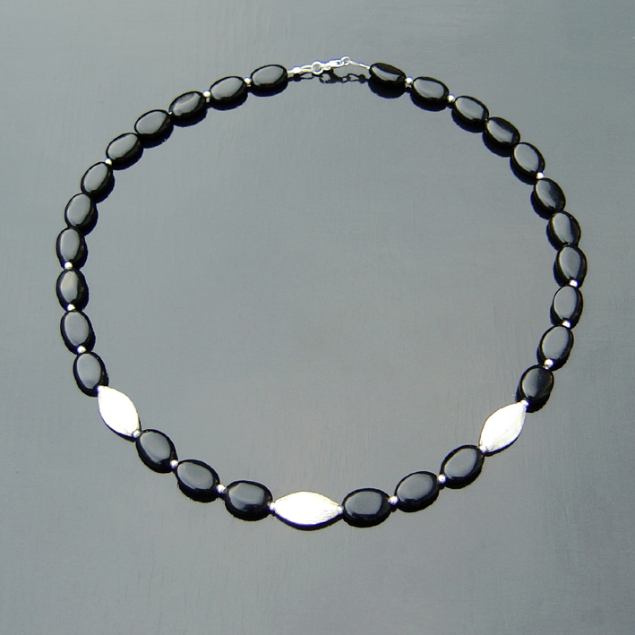 Hämatitkollier mit Perlen und Onyx Urbanes schwarzes Kollier aus Onyxlinsen fein gefasst mit 925o Silberquadern und Verschluß Nr. OAD120602 - 130,00 Euro |